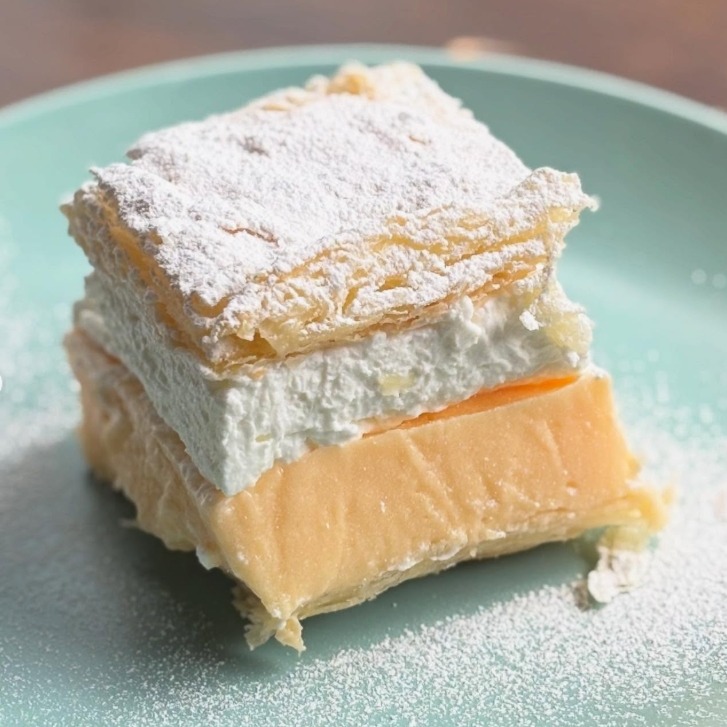 カスタードクリームと生クリームを薄いパイ生地で挟み、上に粉糖をトッピングしたケーキ。