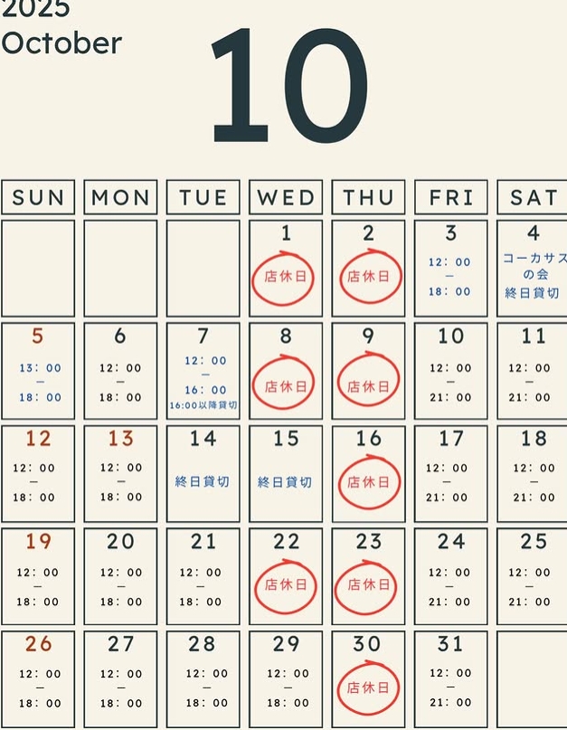 2025.10.14 cafemaltid コメント: 0 10月14日(火)、15日(水)は終日貸切です 本日のランチ 本日14日と明日15日は終日貸切となります。16日(木)は店休日です。17日(金)は通常営業致します。今週は不規則な営業となりますが、何卒よろしくお願い申し上げます。 Tweet この記事のタイトルとURLをコピーする 本日のランチ(10月13日) 関連記事 本日のランチ(8月18日) 本日のランチ(5月11日) 本日のランチ(1月30日) 本日のランチ(6月28日) 本日のランチ(7月23日) 12月22日(日)本日はランチはお休みし、13:00~18:00のカフェ営業となります。 コメント コメント ( 0 ) トラックバックは利用できません。 この記事へのコメントはありません。