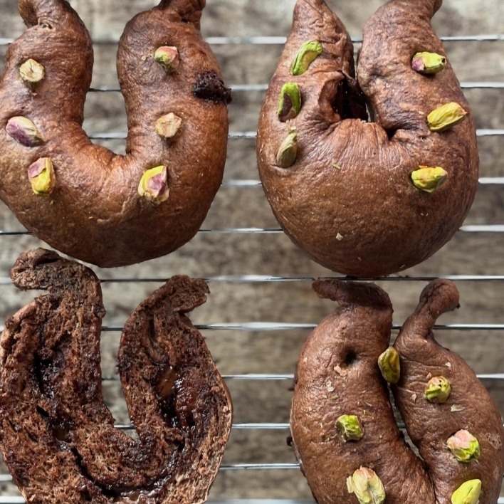 チョコレート生地にヘーゼルナッツクリームとビターチョコを入れ、上にピスタチオを乗せて焼いています。