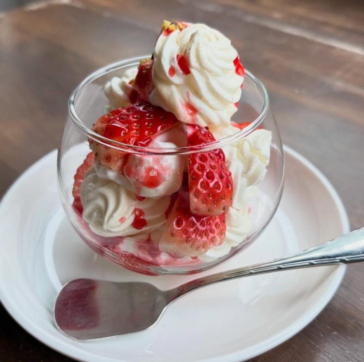 苺、生クリーム、メレンゲを混ぜ合わせたスィーツ。メレンゲを大胆に崩し、クリームや苺と混ぜ合わせて食べるスタイルがおすすめ。サクサクのメレンゲ、とろける生クリーム、フレッシュな苺の甘酸っぱさの調和をお楽しみください。
