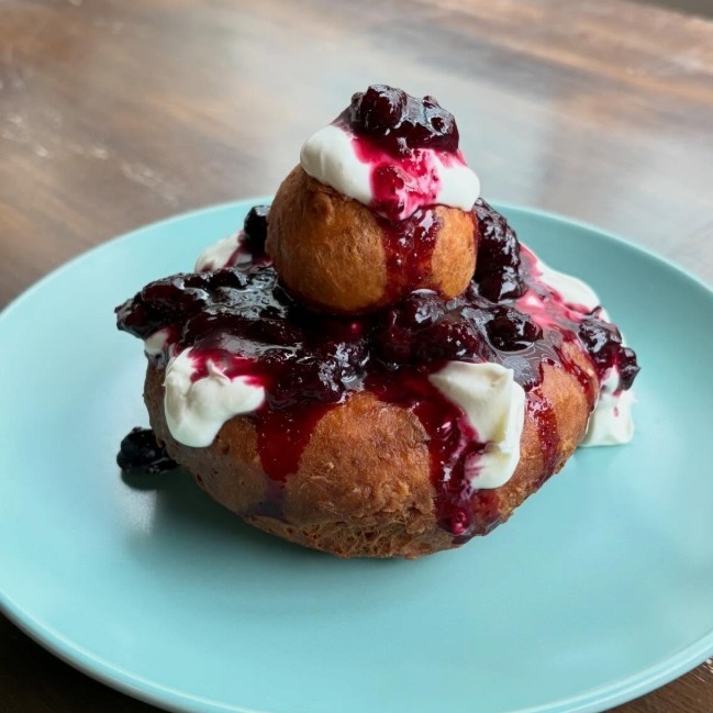 カッテージチーズ、小麦粉、卵を混ぜた生地を揚げ、サワークリームと甘酸っぱいベリー系ジャムをたっぷりと掛けて食べる、ルーマニアを代表する伝統的な揚げドーナツ。外はカリッと、中はモチモチしており、熱さと冷たさ、甘みと酸味が絶妙に合わさった絶品スイーツ。是非ご賞味下さい。