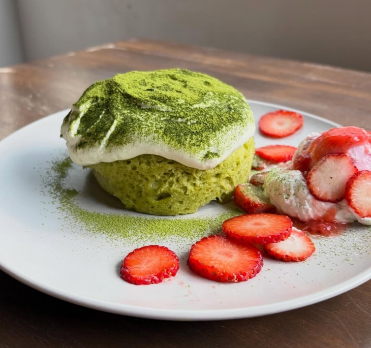 もっちりふわふわの抹茶生地に苺をのせ、その上に濃厚な抹茶チーズクリームをたっぷり重ね抹茶パウダーでコーディング。サイドに添えた苺アイスと苺と一緒にお召し上がりください。