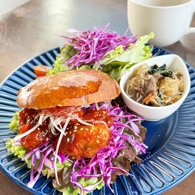 Aランチ:焼きたてバンズのヤンニョムチキンバーガー ¥1200 ドリンク付き¥1450