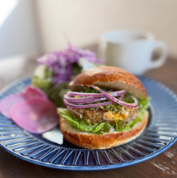 *焼きたてのバンズにアルゼンチン発祥のハーブとニンニク、香辛料を混ぜた万能ソース”チュミチュリソース”とチーズをのせたパティを挟んだジューシーなバーガー